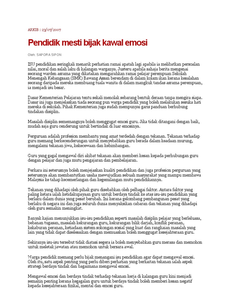 ISI KANDUNGAN HALAMAN 10 PENDAHULUAN 3 11 Pengenalan 3 12 Prinsip akauntabiliti dan intergriti 4 20 Isu Etika Keguruan. Presidennya Kamarozaman Abd Razak berkata ini kerana berlaku pengagihan tugas berdasarkan kepada usaha yang ditampilkan antara guru. Tahap stress guru faktor stress guru sekolah rendah mubaligh PENGENALAN Salah satu matlamat Kementerian Pelajaran Malaysia KPM adalah menyediakan sumber tenaga manusia bagi memenuhi keperluan kemajuan negara di masa hadapan.