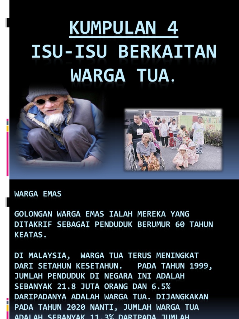 Mereka beranggapan bahawa warga tua tidak produktif dan tidak berupaya membantu mereka. Dasar Warga Emas Negara merupakan komitmen Kerajaan untuk mewujudkan warga emas yang berdikari bermartabat diri dan dihormati dengan mengoptimumkan potensi diri melalui penuaan sihat positif aktif produktif dan menyokong untuk meningkatkan kesejahteraan hidup dalam pembangunan negara. A CARA MEMUPUK SEMANGAT MENGHORMATI WARGA EMAS iMEMBENTUK MASYARAKAT PENYAYANG Kejayaan melahirkan masyarakat penyayang akan membuahkan hasil yang sangat menggalakkanMasyarakat penyayang akan melahirkan anak-anak yang menyayangi dan menghormati orang tuaSikap ini akan memastikan orang tua tidak akan.